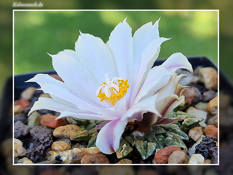 | Kultur in der Wachstumszeit: | Sonniger bis vollsonniger und warmer Standort im Gewächshaus oder Frühbeet Im April vorsichtig angießen damit sich die Saugwurzeln im oberen Bereich der Rübenwurzel zunächst ausbilden Wassergaben durch anstauen empfehlenswert, die Scheitelwolle möglichst nicht befeuchten, der Wurzelhals sollte schnell wieder abtrocknen Eine Gießpause von etwa 4 Wochen Mitte Juli bis Mitte August fördert die Blütenbildung und verhindert Pflanzenschäden Trotz später Blüte im Jahr, die Wassergaben Ende September wieder senken |