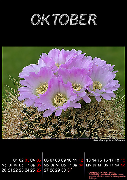 Anfang September verabreicht man keinerlei Düngergaben mehr, ab Ende September werden die Wassergaben drastisch eingeschränkt. Hierbei bietet sich eine vorsorgliche Anwendung mit systemischen Gießmitteln an, um Schädigungen durch saugende Insekten während der Ruhezeit zu unterbinden und diese vorher abzutöten. Rhipsalis-Arten und Epiphyllum werden konstant leicht feucht gehalten. Es zeigen sich bei den ganzjährigen Blühern noch wenige offene Blüten, dafür beginnt aber die Hauptblüte bei den Ariocarpen. Lithops und Conophyten zeigen nun auch Ihre Blütenpracht. Beide Arten bekommen immer wieder etwas Feuchtigkeit, wenn sich eine längere warme und sonnige Witterung abzeichnet. An trüben, grauen und kühlen Tagen sollte man hierauf verzichten. Die Pflanzen sollten nun ihren Jahrestrieb ausreifen, damit sie die Ruhezeit im Winter gut überstehen.
