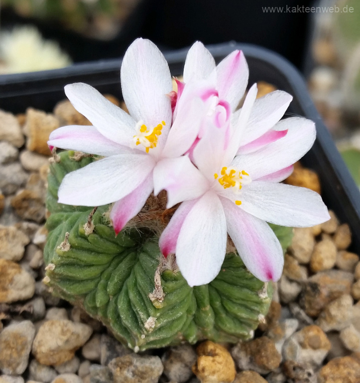 Keine Anfängerpflanze. Die winzigen weißen Blüten mit rosa/magenta farbenen Mittelstreifen öffnen sich ab Mai. Immer wieder neue Blütenschübe sind bis in den September hinein zu beobachten.