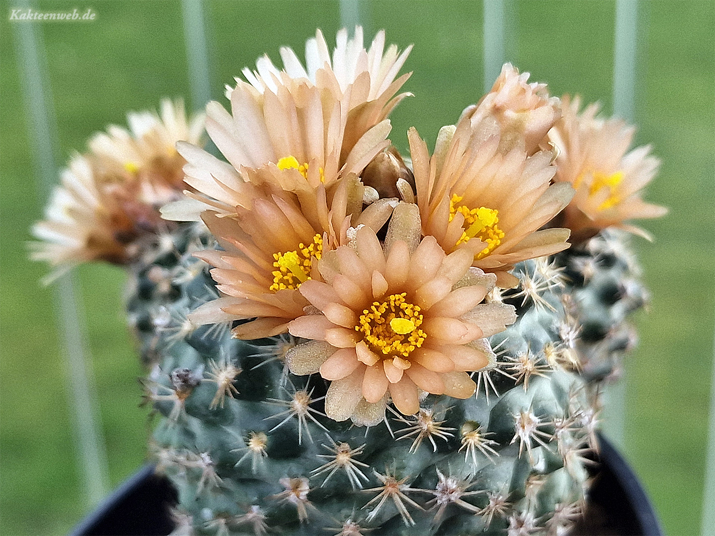 Die pfirsichfarbenen Blüten, mit leichten lila Mittelstreifen öffnen sich sehr früh im Jahr, im März/April und eher seltener ein weiterer (kleinerer) Blütenschub im Juli/August. Die Vermehrung durch Aussaat ist von hohen Verlusten geprägt. Eine sehr geringe Auflaufrate der Samen, gepaart mit sehr hohem Risiko heranwachsende Sämlinge zu verlieren. Daher sollte die Ausaat von einem erfahreneren Kakteenfreund vorgenommen werden. Für einen Anfänger möglicherweise nicht empfehlenswert.
