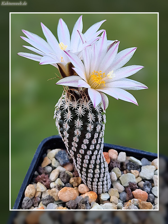 Während der Wachstumszeit von April bis Anfang Oktober, sollte ein vollsonniger bis sonniger und warmer Standort im Gewächshaus oder Frühbeet, regengeschützter Platz auf dem Balkon oder der Terrasse gewählt werden. Die Pflanze ist besonders am wurzelhals nässeempfindlich, daher sollte das Gießwasser möglichts schnell abfließen und das Substrat recht schnell wieder abtrocknen. Es sollte zwischen den Gießintervallen wieder austrocknen. Die weißen Blüten mit dem violetten Streifen öffnen sich in den Monaten April bis Mai.
